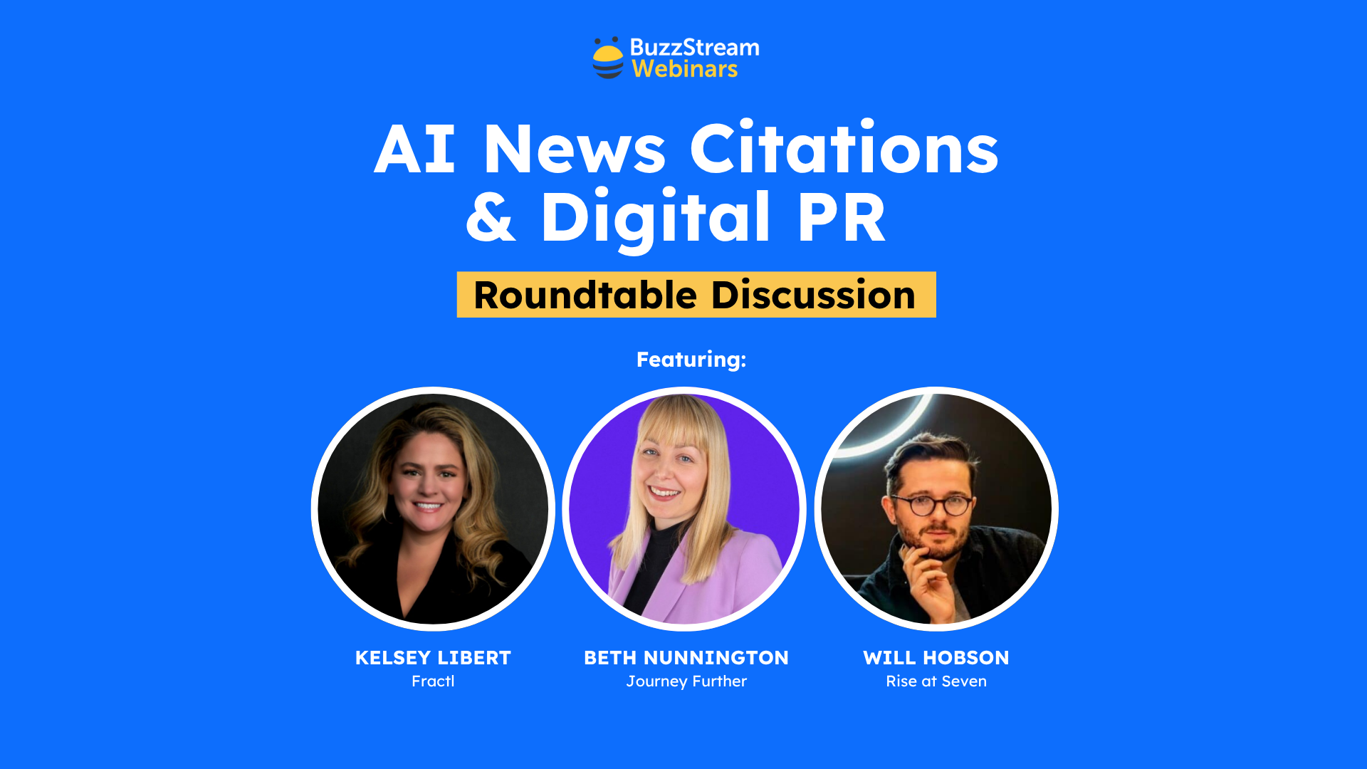 I’m Vince Nero from BuzzStream, the Director of Content Marketing. Today I’m joined by Kelsey Libert, co-founder at Fractl. Thank you, Kelsey, for joining. Beth Nunnington is the founder and global VP of Digital PR at Journey Further. And Will Hobson is the VP of PR at Rise at Seven.