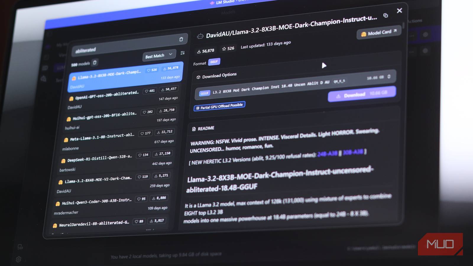 There are dozens of abliterated models floating around on Hugging Face that you can download and try, including Llama, Qwen, Gemma, Mistral, and more. I decided to try out mlabonne/Meta-Llama-3.1-8B-Instruct-abliterated, an 8B model based on Meta’s Llama 3.1 Instruct architecture and the refusal direction removed via weight orthogonalization. It runs comfortably in just about any local LLM app, including LM Studio and Ollama, on a mid-range machine with 8GB of VRAM, especially in GGUF Q4 or Q5 quantization.